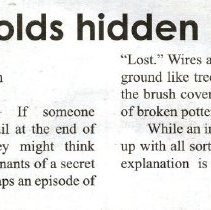 An article from the Sippican Week of October 9, 2014 titled "Trail Holds Hidden History" about the Marconi Wireless Station and the Radio Tower property Trail hike to commemorate the 100th anniversary of the Marconi Station conducted by the Sippican Lands Trust. There are photographs of artifacts left from the installation.