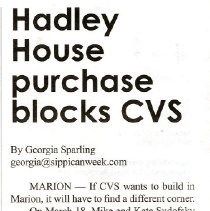 An article, from Sippican Week, Thursday March 31, 2016, titled 'Hadley House purchase blocks CVS', written by Georgia Sparling.