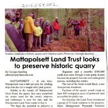 An article from Sippican Week, dated 12/1/2016, titled "Mattapoisett Land Trust looks to preserve historic quarry". Pink granite can be found in the Marion Town Hall. also see #2016.006.001