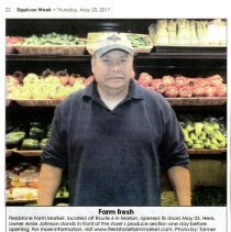 From the Sippican Week, dated May 25, 2017, a digital photograph and caption titled "Farm Fresh". Fieldstone Farm Market, located off Route 6 in Marion, opened May 25, 2017. The photograph shows owner Arnie Johnson behind the counter. It's on the site of the former Frigate Restaurant.