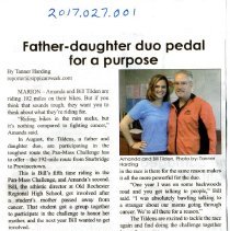 An article and digital photograph from the June 8, 2017 Sippican Week titled "Father-daughter duo pedal for a purpose" . Amanda & Bill Tilden of Marion plan on riding their bicycles 192 miles from Sturbridge to Provincetown in the August Pan-Mass Challenge to help raise funds for the Dana-Farber Cancer Institute.