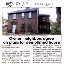 A newspaper article from thr Sippican Week dated 8/31/2017, titiled "Owner, neighbors agree on plans for demolished house". A historic house in Marion at 41 Main Street has been demolished. It was the home of Captain Stephen Hammond and was built in 1802.