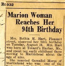 Mrs. Bethia M. Hart of Pleasant St, Marion celebrated her 94th birthday on Aug. 16